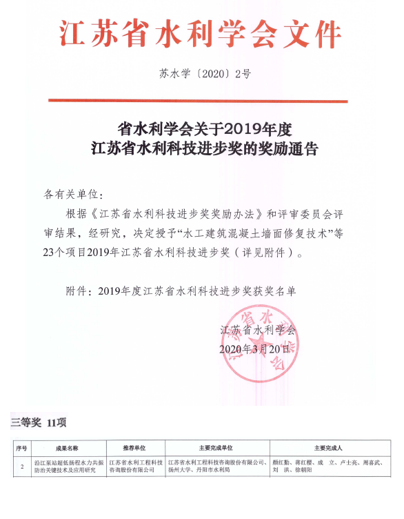 | 公司喜获江苏省水利科技进步奖作者:admin 来源: 日期:2020-3-24 15:21:49 人气: