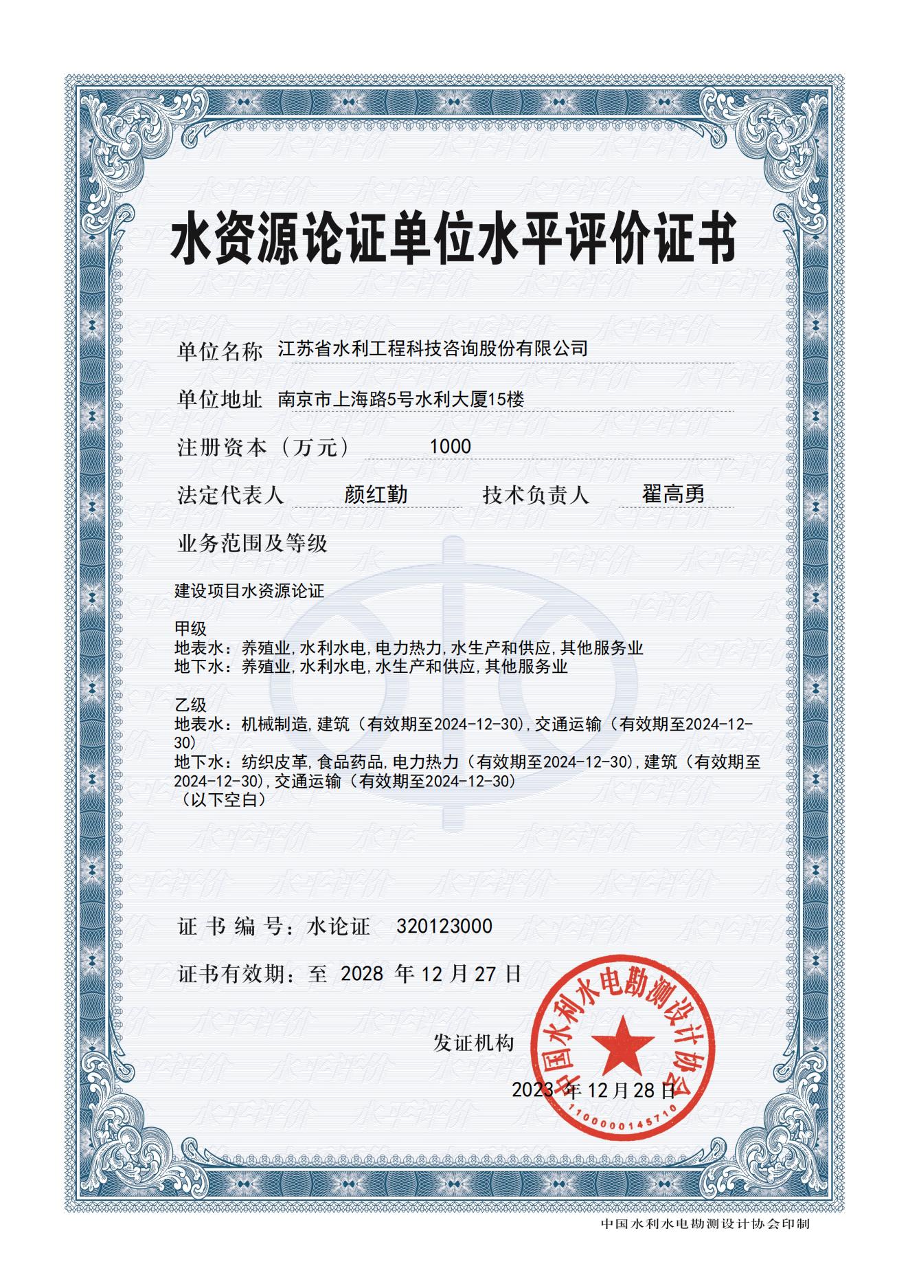 水文水资源调查评价电子证书