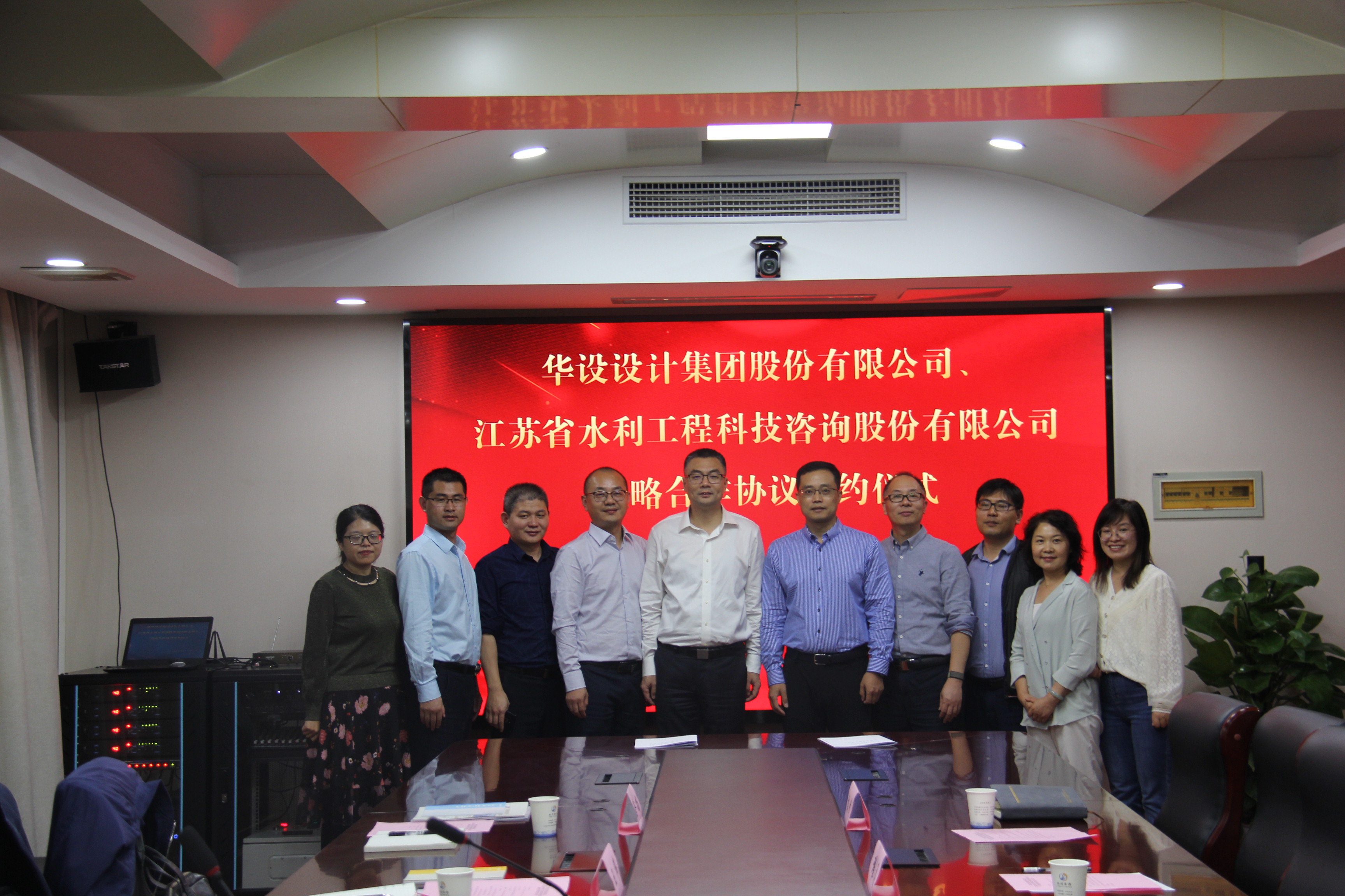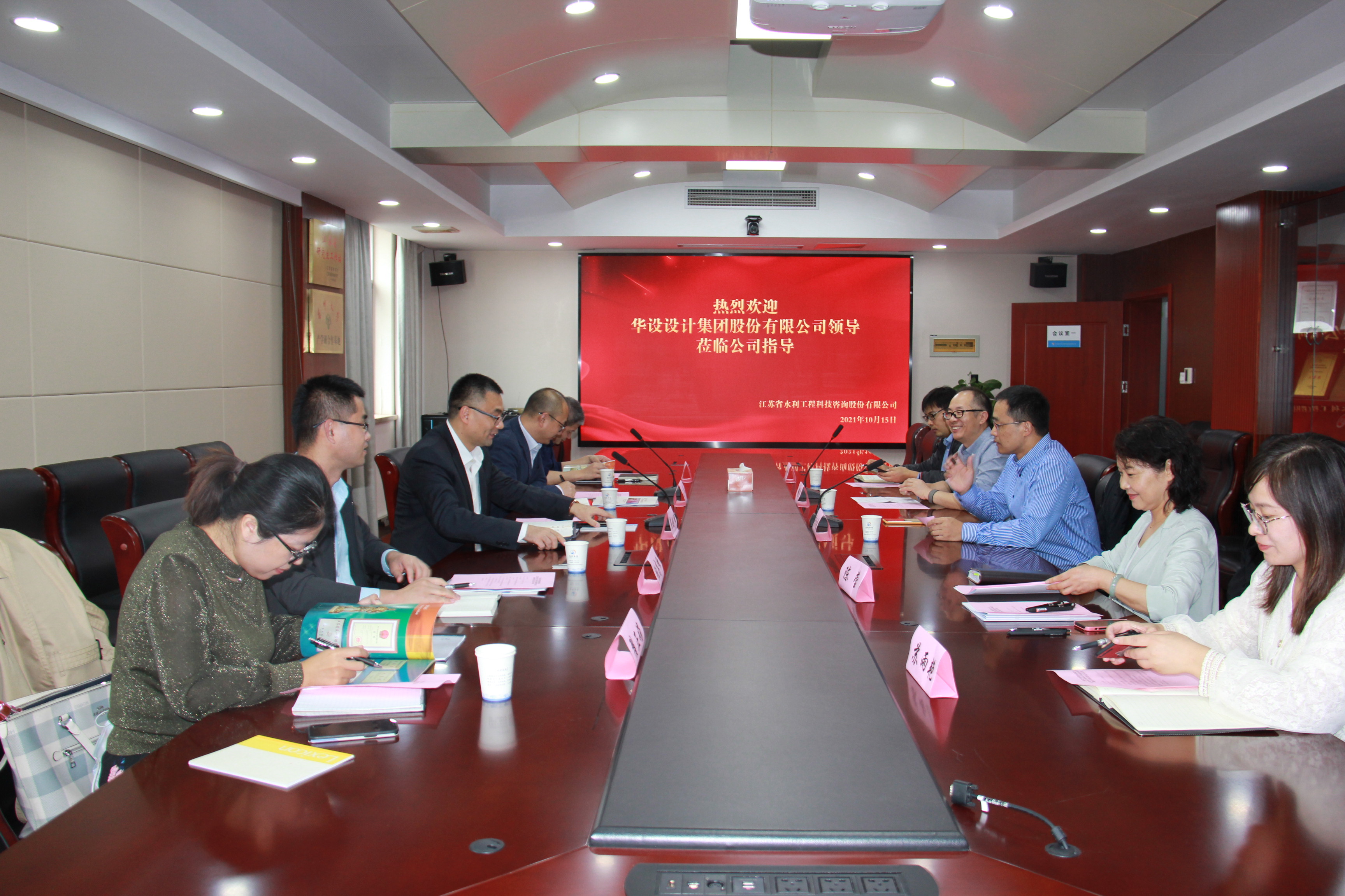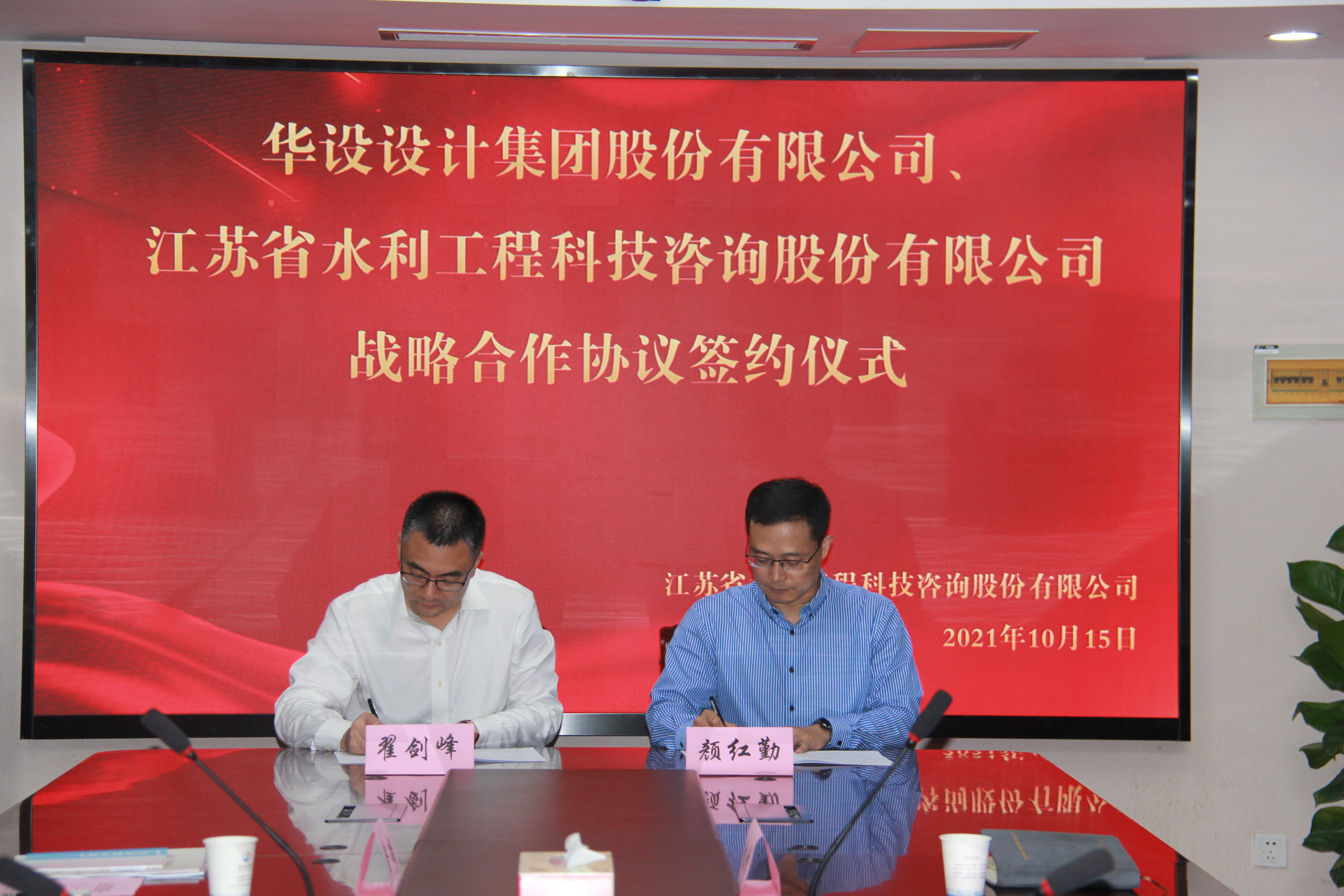 20211015日下午1330分,我公司与华设设计集团战略合作签约仪式在5楼会议室顺利举行。公司董事长颜红勤和华设设计集团副总裁翟剑峰分别代表双方在战略合作协议上签字。华设设计集团水运水利设计研究院王伟、张高峰、水利规划所齐鲁尚、翟正娟,我公司副总经理翟高勇、综合部陈莹、规划部甄峰、发展经营部苏雨艳等相关人员见证了签约仪式。