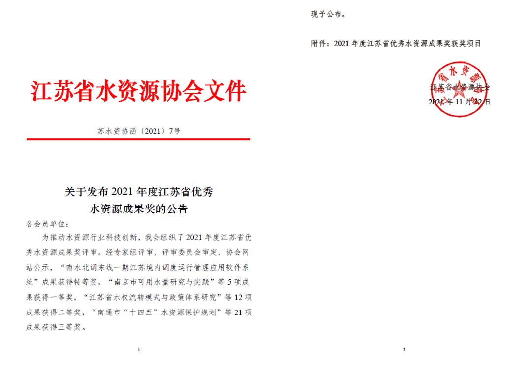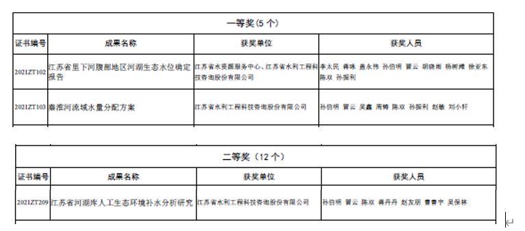 | 喜报:我司在2021年度江苏省优秀水资源成果奖评审中获得佳绩作者:admin 来源: 日期:2021-11-17 11:22:31 人气: